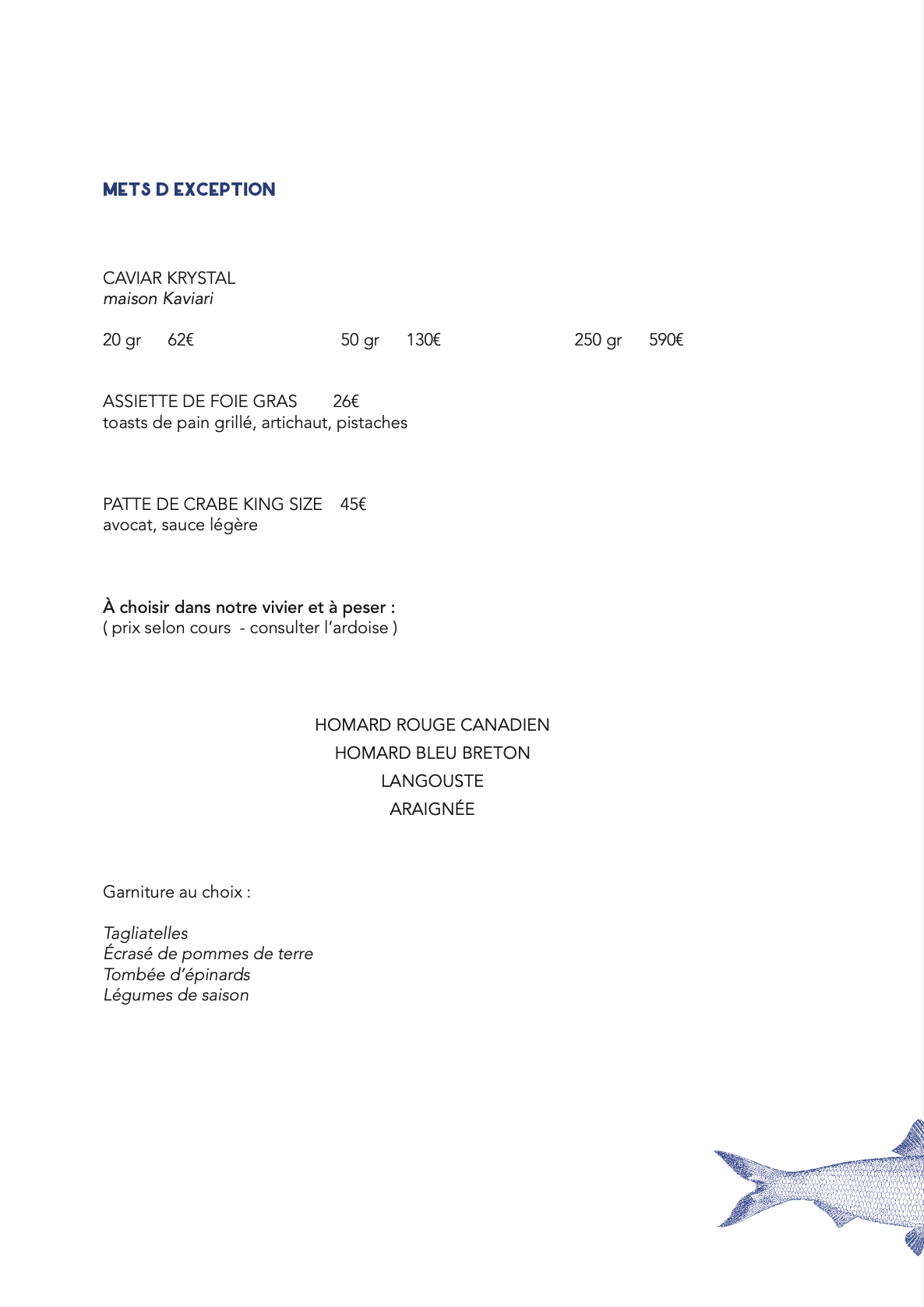Voici la carte des plats cuisinés du Sacrebleu, pour les envies plus brutes l'intégralités de nos plateaux sont disponibles en dégustation sur place, ainsi que les différents produits de l'étale et du vivier... Homards, langoustes, tourteau... À vous de partir en pêche !